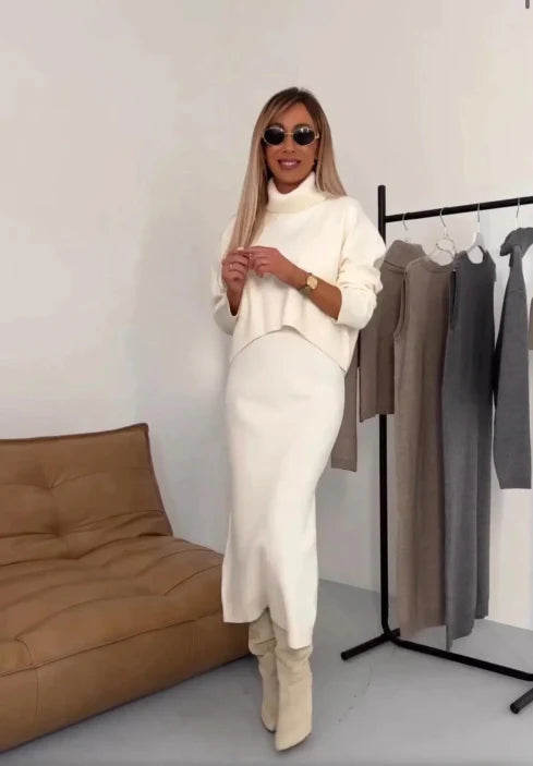 Dopasowana spódnica midi podkreśla sylwetkę w subtelny sposób, natomiast oversize’owy golf nadaje całości nowoczesnego charakteru. Komplet zapewnia swobodę ruchów i jest odpowiedni zarówno do codziennych stylizacji, jak i na bardziej formalne okazje.