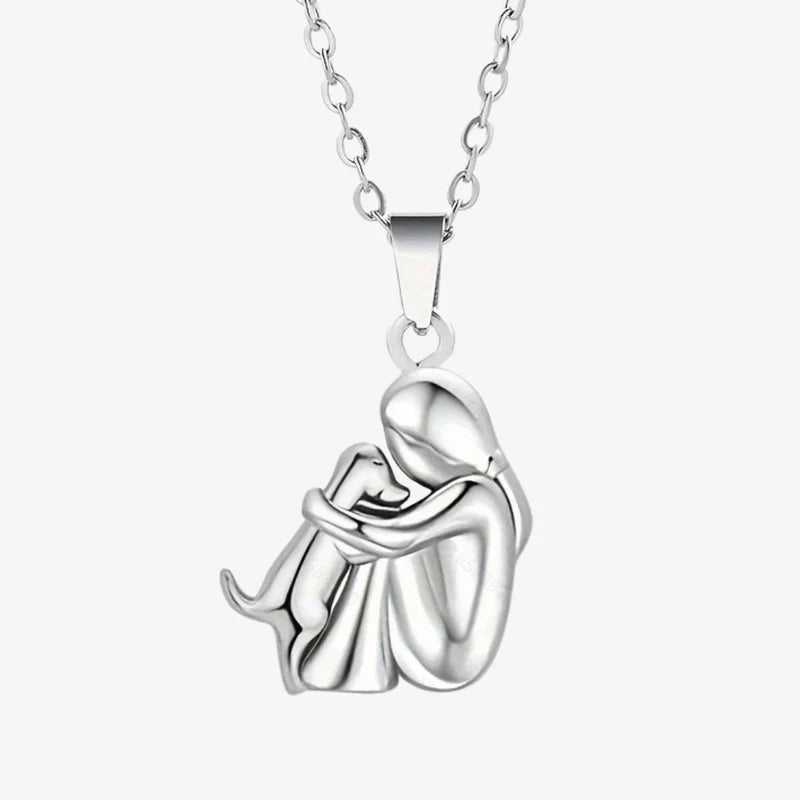 Subtelna sylwetka tulącej postaci i wierny pies, wtulony z ufnością, tworzą symbol więzi tak głębokiej, że słów nie trzeba.